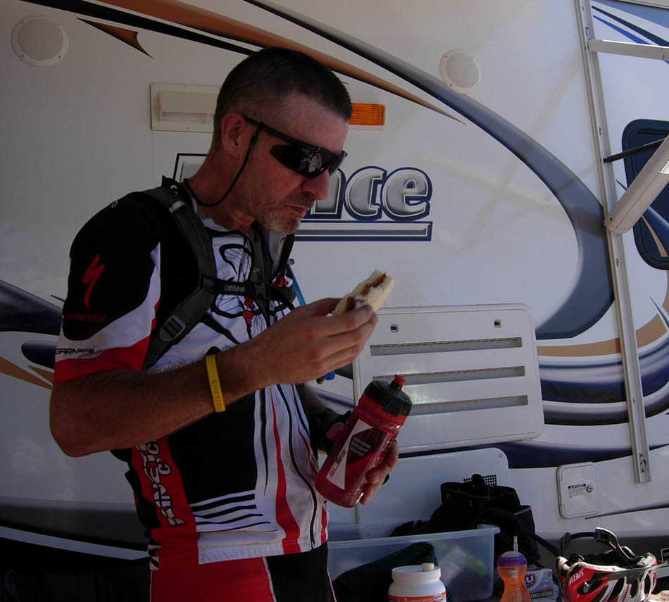 The course was tough. It was very bumpy, with very few sections to even grab the bottle, let alone sit up and stretch or grab a Gu. This would lead to problems later on, which we'll get to soon. The CamelBak was a must, and it came back nearly empty each lap. Problem was, I only carry plain water in the CamelBak. The bottle has my electrolyte drink which is also a major source of in-race calories. Strike one.