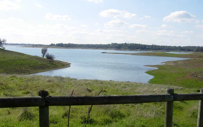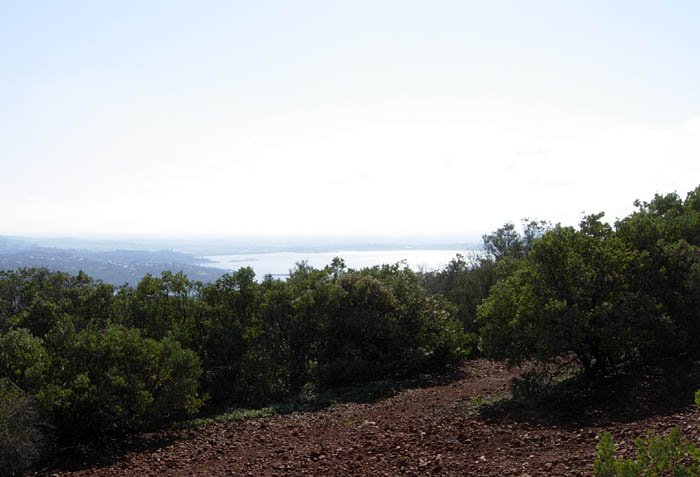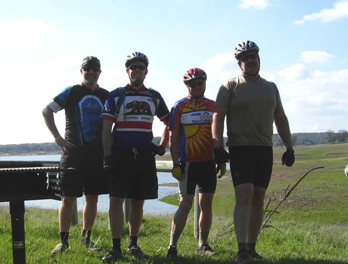 The obligatory "before" shot. (L-R: Kevin, Cris, Bob, Kip) Another "before" with the trail in the background At the top of Flagstaff Hill Nice view from the top "Two"? "Peace"? Or a fork in the trail?? More view From the Rattlesnake Bar Campground The lake was much higher than last time |