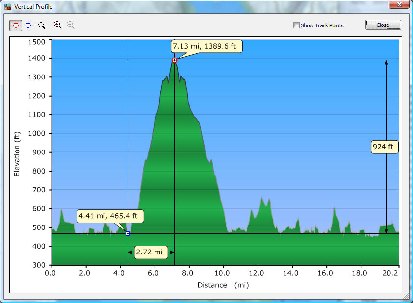 Sunday March 8: Hound Hop, Salmon Falls, Folsom, CA What a FANTASTIC DAY. Lovin the time change. Route was out from the bridge, then up and over Flagstaff Hill, back on the road to the campground, then back, 20.5 miles total. View the vertical profile from my GPS. Check out the Garmin Connect page with all kinds of mapping and GPS data analysis from the ride. Check out some photos from the ride: |